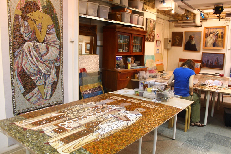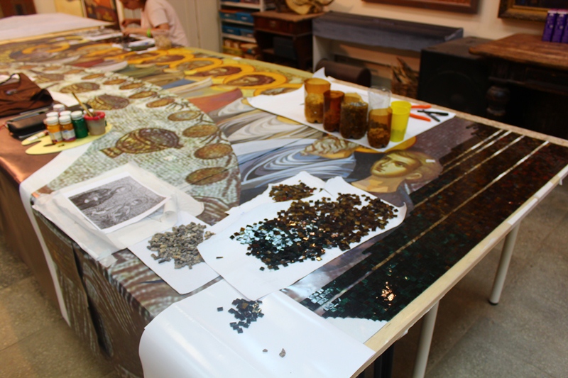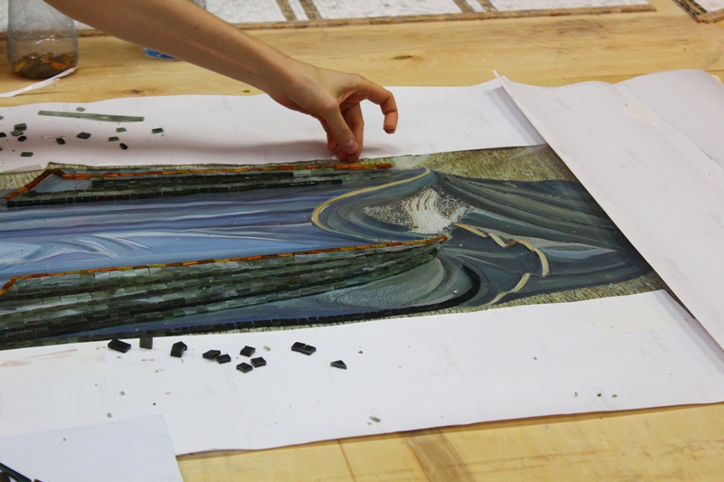 Мне стало интересно узнать о технике создания подобных объемных шедевров из стекла. Директор и преподаватель «Возрождения» Алексей Федоровский был рад ответить на все мои вопросы и подробно объяснить весь процесс работы над мозаикой. Оказывается, создавать мозаику не такой просто: сначала кусачками камень и стекло раскалывают на ровные кусочки нужного размера и формы, а потом на нарисованном и раскрашенном эскизе собирается само изображение. Делается это тоже не быстро – все части будущей картины подбираются по цветам, и на глазах появляются переливы оттенков, тени и объем. Далее собранные в картину кусочки материала приклеиваются на временную пленку, а сверху накрываются и приклеиваются к ткани. Затем пленку снимают, и изображение остается на ткани. Такую картину можно вмонтировать куда угодно, после чего при смачивании водой убирается и ткань, остается только мозаика.