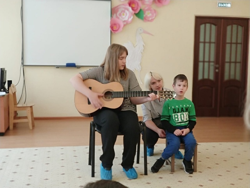 Перед посетителями выступили детки из разных групп — они подготовили спектакль «Уши, лапы и хвосты». А еще бывший воспитанник центра «Вера. Надежда. Любовь» вместе со своей приемной семьей спел под аккомпанемент на гитаре песенку «Детство».