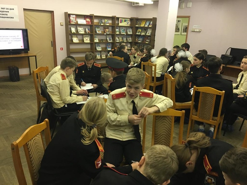 Школьники узнали интересные факты из биографии создателя всемирно известного автомата Калашникова. После теоретической части 25 учеников разделились на 5 команд, чтобы сразиться в тематическом интеллектуальном бою, организованном сотрудниками библиотеки.